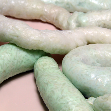 Edible engineered e-coli containing green fluorescent protein (GFP) within the sausage fluoresce after they finish the arsenic extraction process. Food such as the fluorescing rice sausage provides new dining possibilities and experiential sensations.