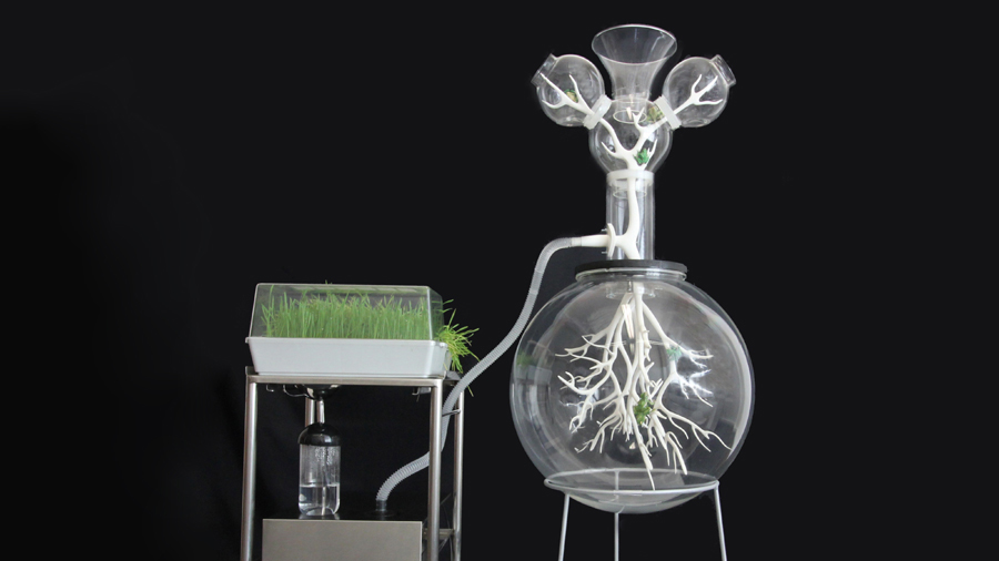 Landscape Within proposes a digestive machine that creates an external additional stage to our gut system. With future upgrades, the machine will move inside the body as an extra stomach organ. These gut enhancements ensure personality stability, counter aggressive behaviour, stimulate IQ development, trigger memories to combat dementia and promote a safe environment for social interaction for communities that have suffered isolation. The machine does this by using engineered bacteria designed to separate food from heavy metal contaminants, resulting in safe consumption and the nano-sized metals that are such a valuable resource. The machine’s ‘tube within a tube’ construction mirrors our own body plan. It enhances the gut, which as an organ is an early evolutionary development made to extract energy from our environment, and which links us to our animal ancestors. This highlights our digestive system as a crossroads between us and the landscape, the past and the future.