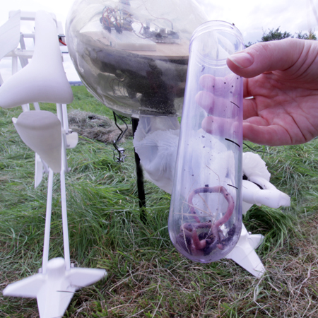 A woman breeds ‘super-earthworms’ to help clean the polluted landscape and protect her future grandchildren. She has developed a range of robots to retrieve her earthworms from the ground and to track their consumption of the heavy metals, including arsenic (As), lead (Pb), copper (Cu) and zinc (Zn). They also enable her to collect a specific protein called metallothioneins (MITs), which the earthworms produce to wrap up and seal off the harmful metals. The earthworms act as a biosensor to detect what heavy metals are present in the ground. The woman’s robots also revive a lost memory that her grandchildren may not experience. In her grandparents’ lifetime, large flocks of birds of diverse species gathered to feed in the fields. The flocks have diminished and some bird species have disappeared due to contamination and past crop-sprays such as DDT. Whilst her robots echo the lost birds, her worms work to decontaminate the land. |