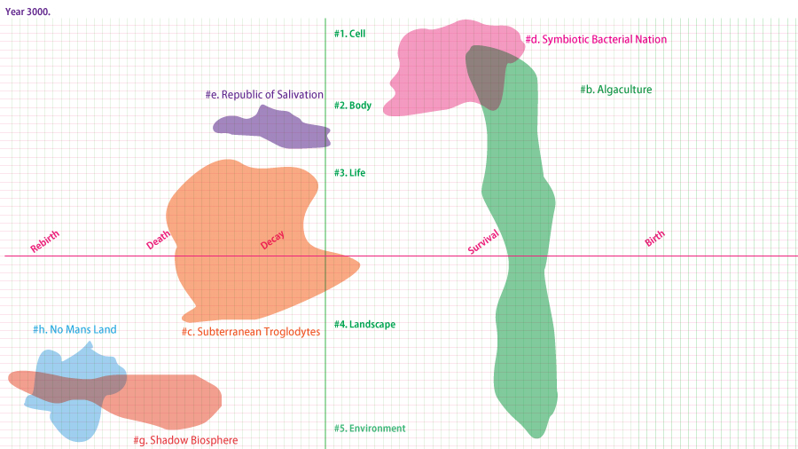 Within the Shadow Biosphere, new organisms will be tasked with erasing Man’s destructive effects and stabilise the planet’s life support. We propose that human’s will utilise emerging technology such as synthetic biology and phytoremediation to create novel chimeras and new organisms able to fill traditional and new environmental niches. |