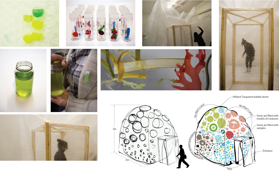 We created a inflated dome to host a collection of the Shadow Biosphere. This hosted specimens from our six taxonomic groups. It contained a mixture of real samples and models of man-made species of the future. We performed interactive cleasing teaceremony by inviting audience into the dome.